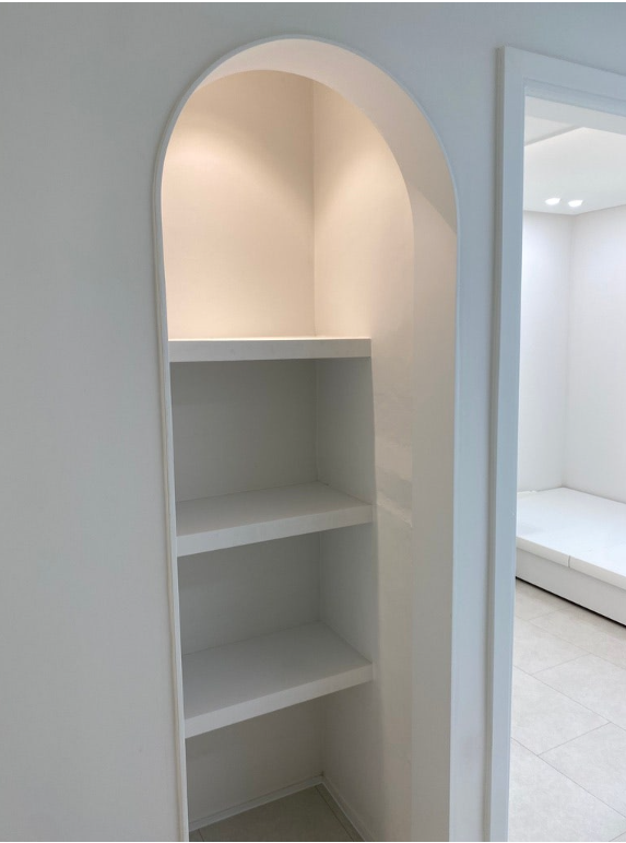 처음엔 깊이 너무 깊어서 대표님이 고민을 조금 하셨지만 깊이를 합판으로 덧대어 줄이고 칸막이와 조명을 넣어 감성있는 공간으로 재탄생시켜주셨다. 무엇보다 가장 포인트는 거실 입구와 같은 라운드 형식으로 완성하여 거실과 잘 어울리는 세심한 배려이다.